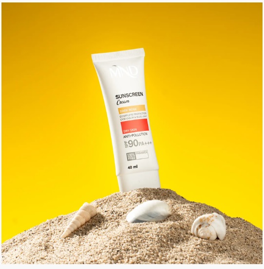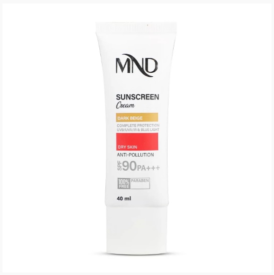 تابش طولانی مدت نور خورشید به پوست، یکی از عوامل پیری زودرس پوست است. در اصل اشعههای UVA و UVB خورشید با ایجاد رادیکالهای آزاد در پوست، موجب آسیب دیدن ساختارهای حیاتی پوست شده و ایجاد لک و چین و چروک را تسریع میکنند. همچنین تحقیقات علمی اخیر نشان دادهاند که طیف مادون قرمز ساطع شده از خورشید و نور آبی منتشر شده از لوازم الکترونیکی (رایانه، گوشی همراه، ...) هم در آسیب دیدن پوست نقش دارند، درنتیجه برای تولید یک محصول ضدآفتاب کامل، مقابله با این اشعهها نیز باید مورد توجه قرار بگیرد. این کرم ضدآفتاب MND با فاکتور حفاظتی 90، بهصورت فاقد پارابن، به رنگ بژ تیره و مناسب برای پوست خشک تولید شده و با بهرهگیری از ترکیبات و فیلترهای مناسب قادر است مانع صدمه دیدن پوست توسط اشعههای فوقالذکر شود.