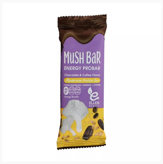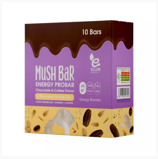 پروتئین تغلیظ شده شیر، شیر خشک بدون چربی، قارچ صدفی، پورتئین کنسانتره وی، پروتئین ایزوله سویا، جو دوسر پرک، مالتودکسترین، گلوتن، دانه چیا، دانه کتان، مغز دانه های خوراکی، گلوکز، خمیر خرما، ارده، روغن گیاهی و قنادی، سوربیتول، جینسینگ، گلیسیرین، کافئین، لسیتین سویا، طعم دهنده. قارچ صدفی: کمک به تقویت سیستم ایمنی، سلامت قلب و کنترل چربی خون. پروتئین وِی: کمک به تاخیر در بروز علائم پیری پوست، کمک به کاهش وزن و تقویت سیستم ایمنی. جینسینگ: کمک به بهبود عملکرد ذهنی، کمک به کاهش وزن، و افزایش سطح انرژی. کافئین: افزایش انرژی، هوشیاری و تمرکز، بالا بردن گردش خون و کمک به کاهش تجمع چربی